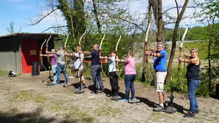 Sie haben ein Zeitfenster von einer Stunde zwischen 11.30 Uhr und 15.30 Uhr zur Verfügung. Legen Sie bei der Anmeldung unter Bemerkungen die Startzeit fest und wählen Sie Armbrustschiessen (erst ab 12 Jahren möglich), Blasrohr, Bogenschiessen oder Platzgen.