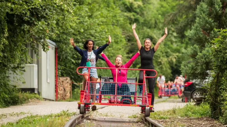 - Kinder bis 10 Jahre können als 5. Person auf dem Schienenvelo mitfahren